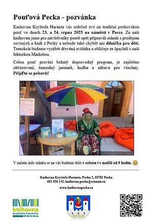 Městys Pecka a Knihovna Kryštofa Haranta vás srdečně zvou na tradiční peckovskou pouť na náměstí. Za naši knihovnu jsme pro návštěvníky poutě opět připravili stánek s prodejem suvenýrů a knih z Pecky a nebude také chybět ani dílnička pro děti. Tentokrát budeme vyrábět dřevěná zvířátka a obličeje ze špachtlí s naší lektorkou Markétou.